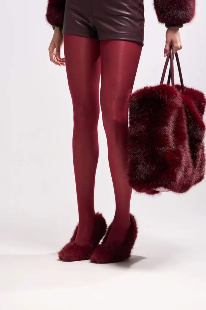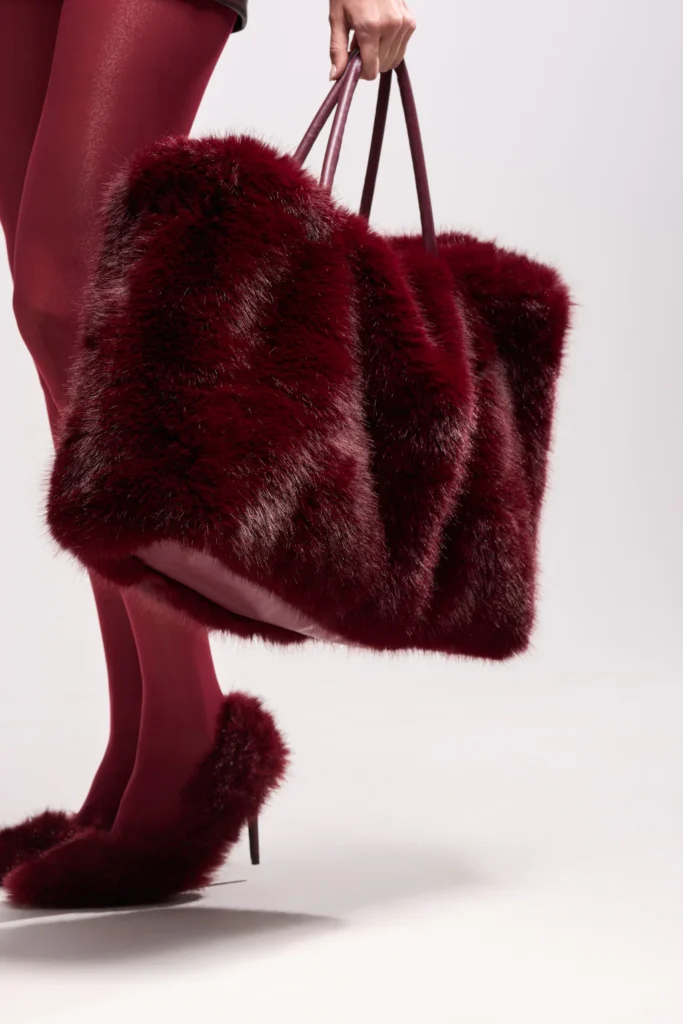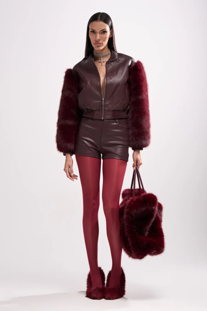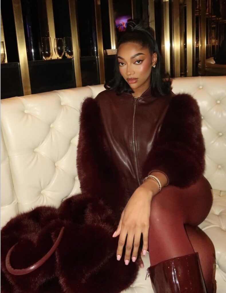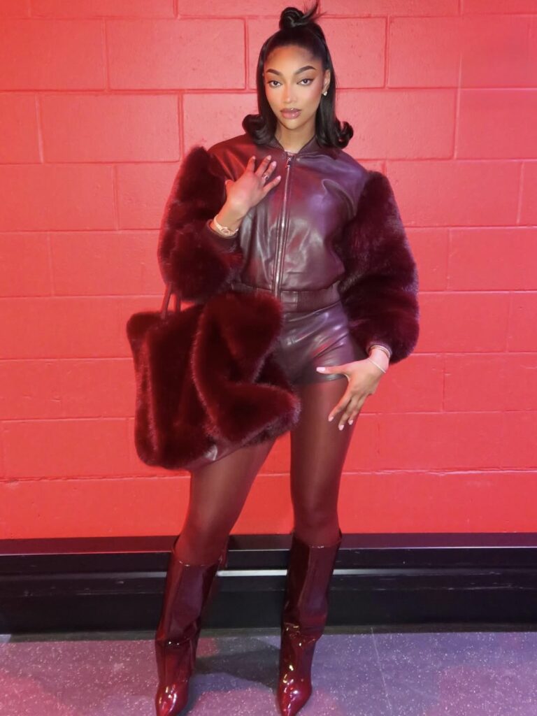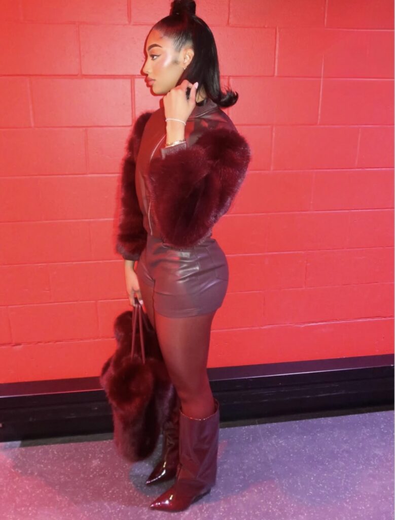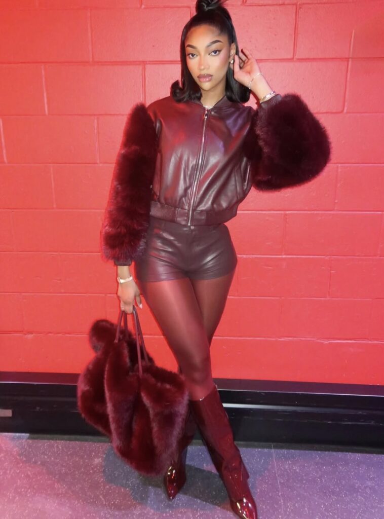 For the outing, the WNBA star was styled in AKIRA, delivering a bold yet polished courtside look. Reese layered the AKIRA Fur Sleeve Bomber in a rich burgundy over Callie Faux Leather Shorts, paired seamlessly with oxblood opaque tights for a sleek, tonal moment. She accessorized with the AKIRA Alaia Faux Fur Tote, adding texture and luxury to the ensemble.