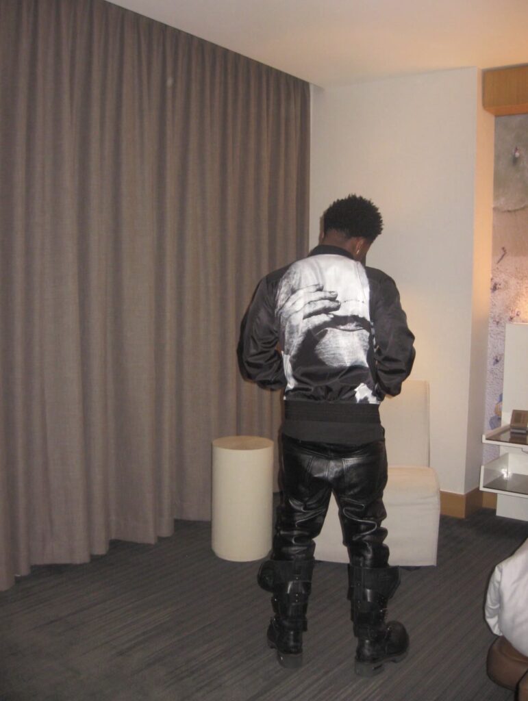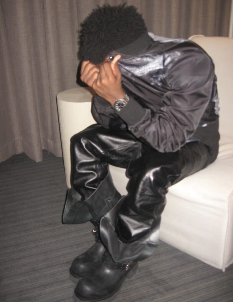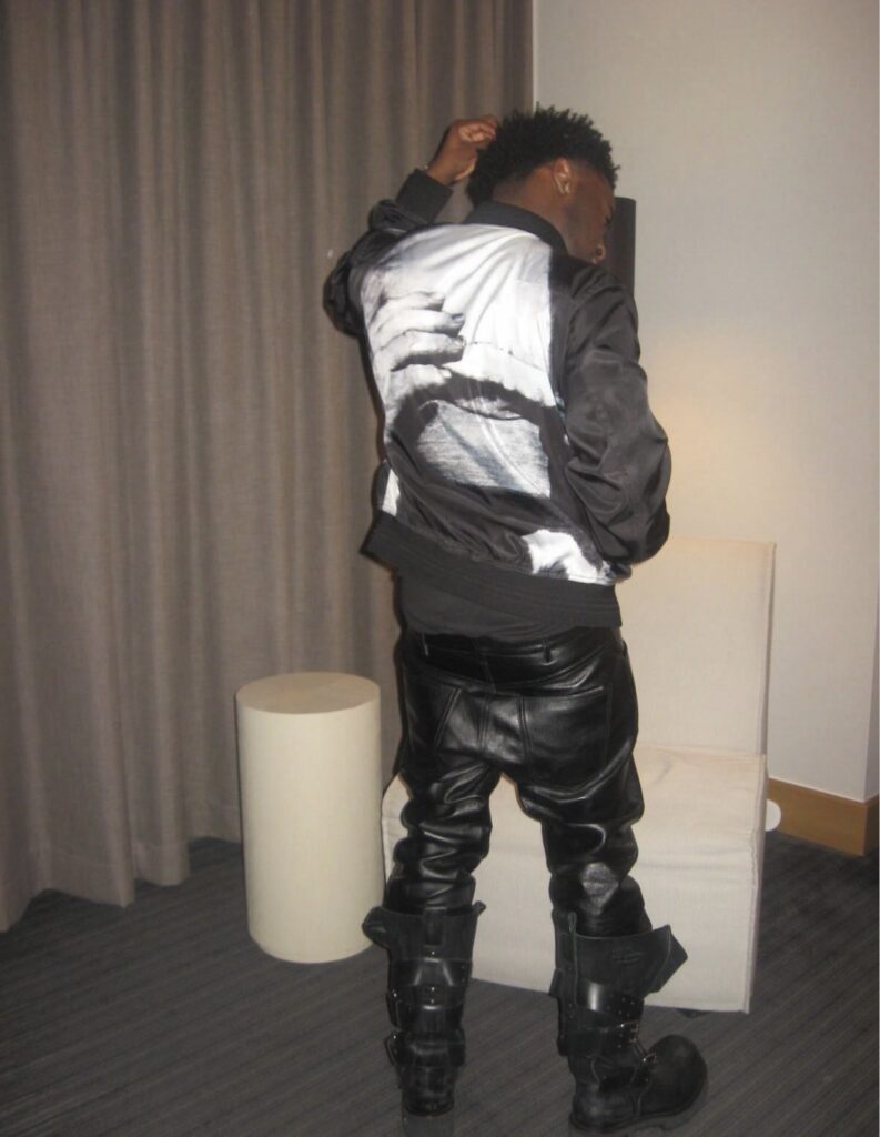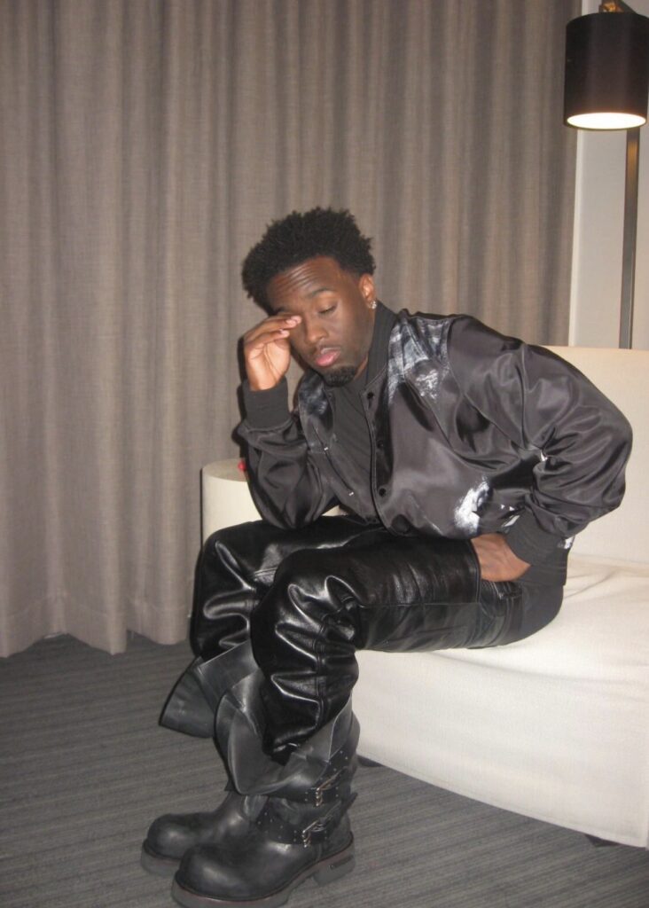 In a series of newly shared photos, the rising designer delivered a sleek, monochromatic statement, opting for a black-on-black ensemble that blended luxury with edge. The standout piece? A rare Dior Homme SS2018 François Bard Surrealist collection silk bomber jacket, layered effortlessly over black waxed denim.
