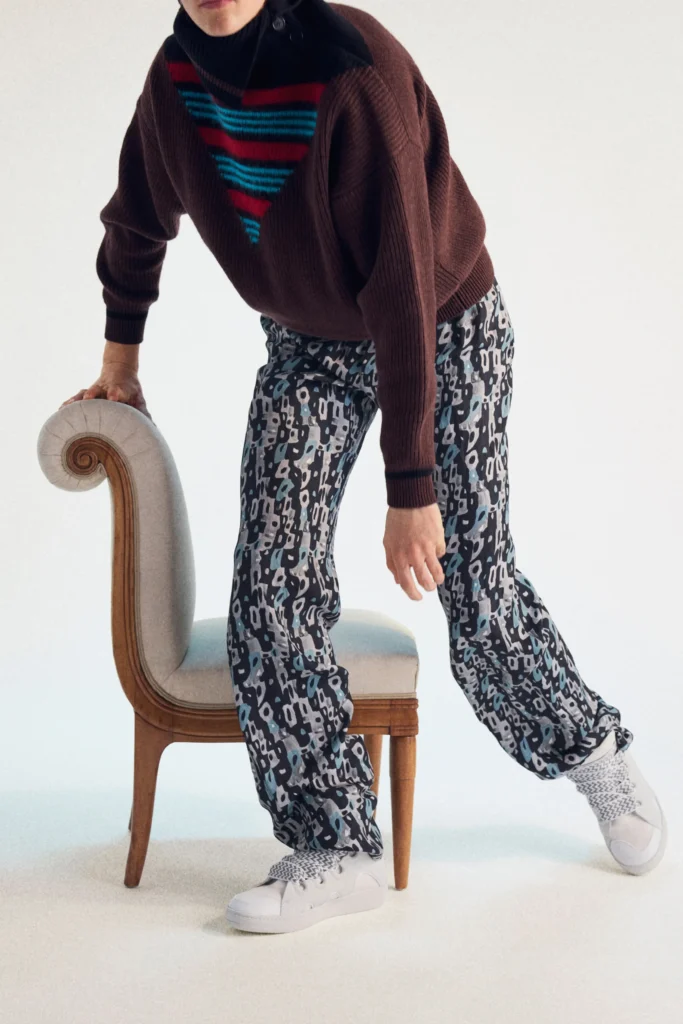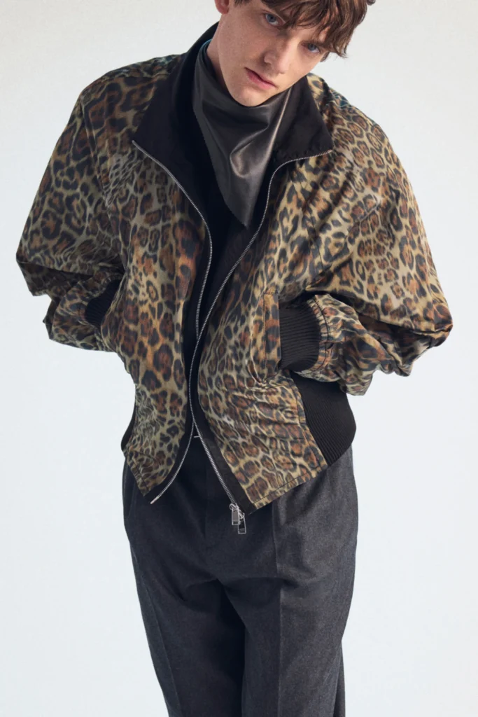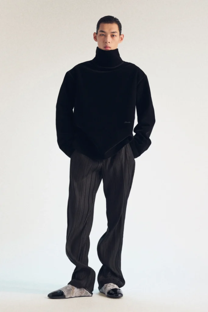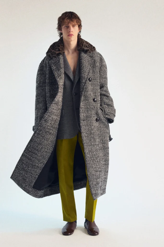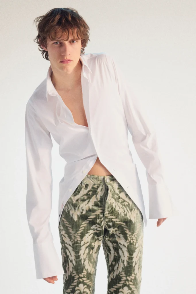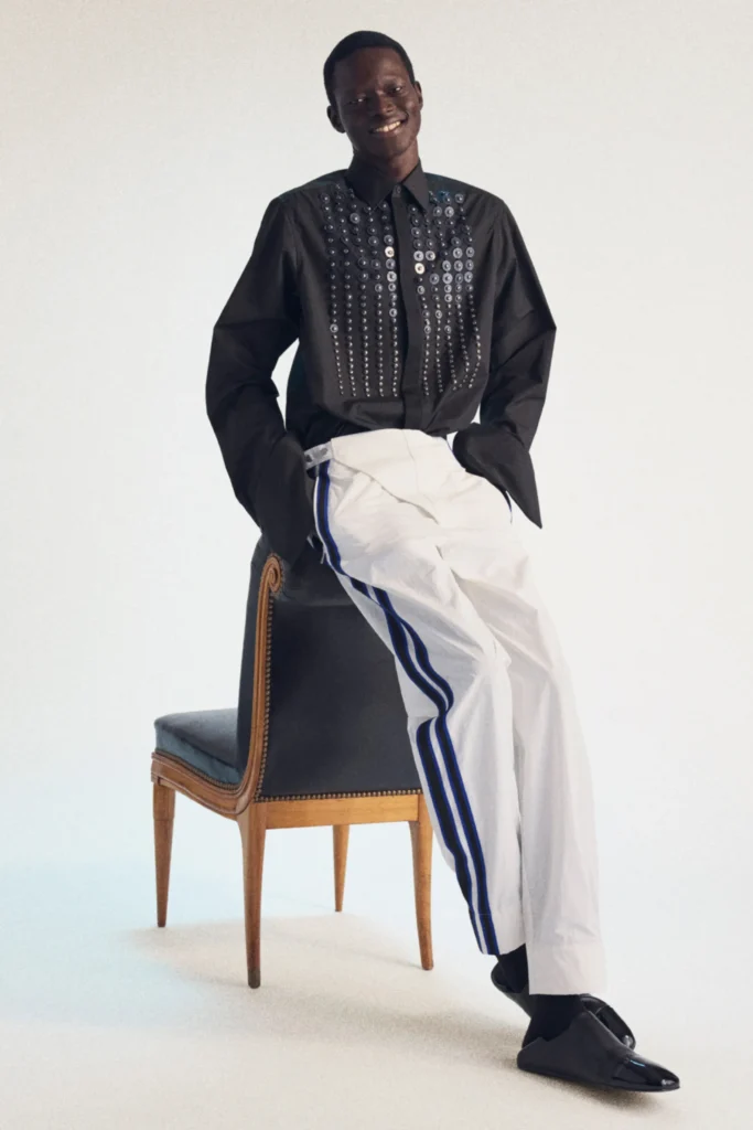 Those historic textiles found new life in the collection. A richly textured fabric originally sourced from Venice’s storied Bevilacqua—where weaving has continued for over 500 years—was reimagined by the same workshop in a modern monochrome palette, appearing on a denim jacket and matching jeans. Elsewhere, Copping leaned into tactile drama: leopard-spotted flocked velvet trousers dyed in a striking absinthe green, tuxedo pants crafted from Fortuny-pleated fabric, and evening shirts whose bib fronts were adorned with graphic paillettes and beadwork.
