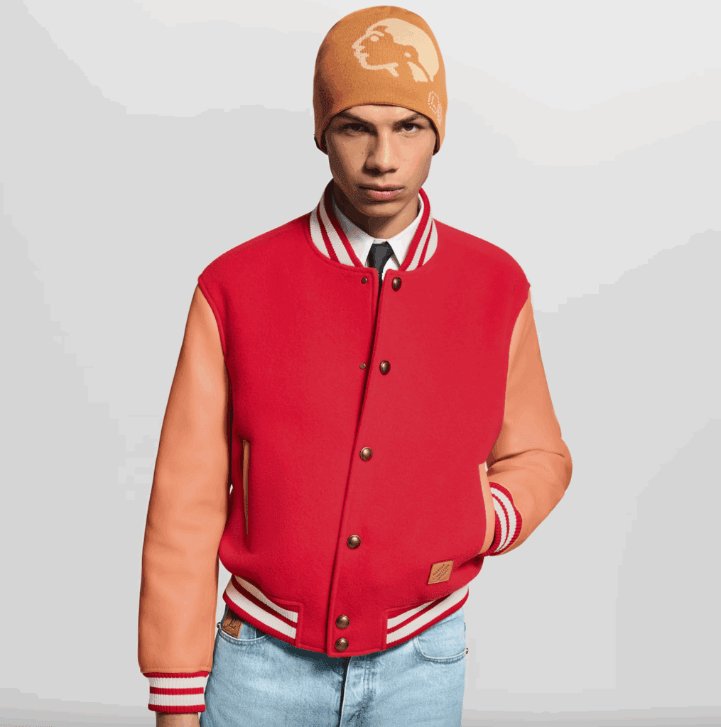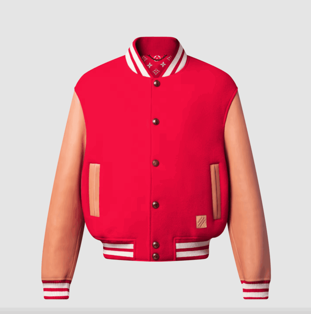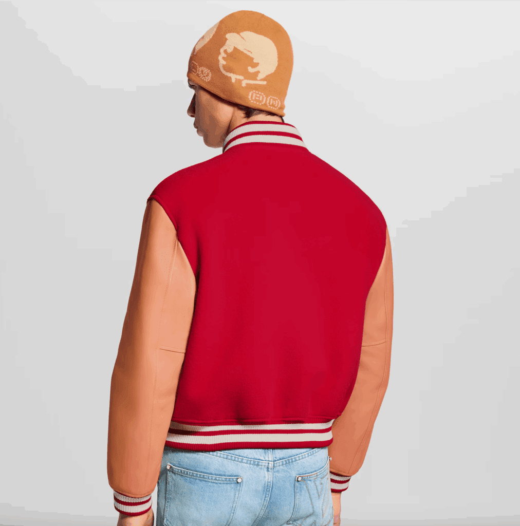 Pulled from Louis Vuitton’s Fall–Winter 2025 collection, the timeless red varsity delivers a refined take on an all-American classic. Its bold red wool body contrasts sharply with natural calfskin sleeves, crafted from the House’s signature VVN leather—a direct nod to the heritage material famously used on Louis Vuitton trunks and travel bags. Inside, an allover Monogram lining adds a graphic flourish, while a Marque L. Vuitton Déposée leather patch anchors the piece with unmistakable branding.