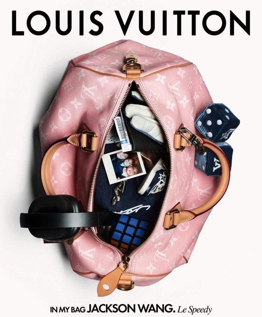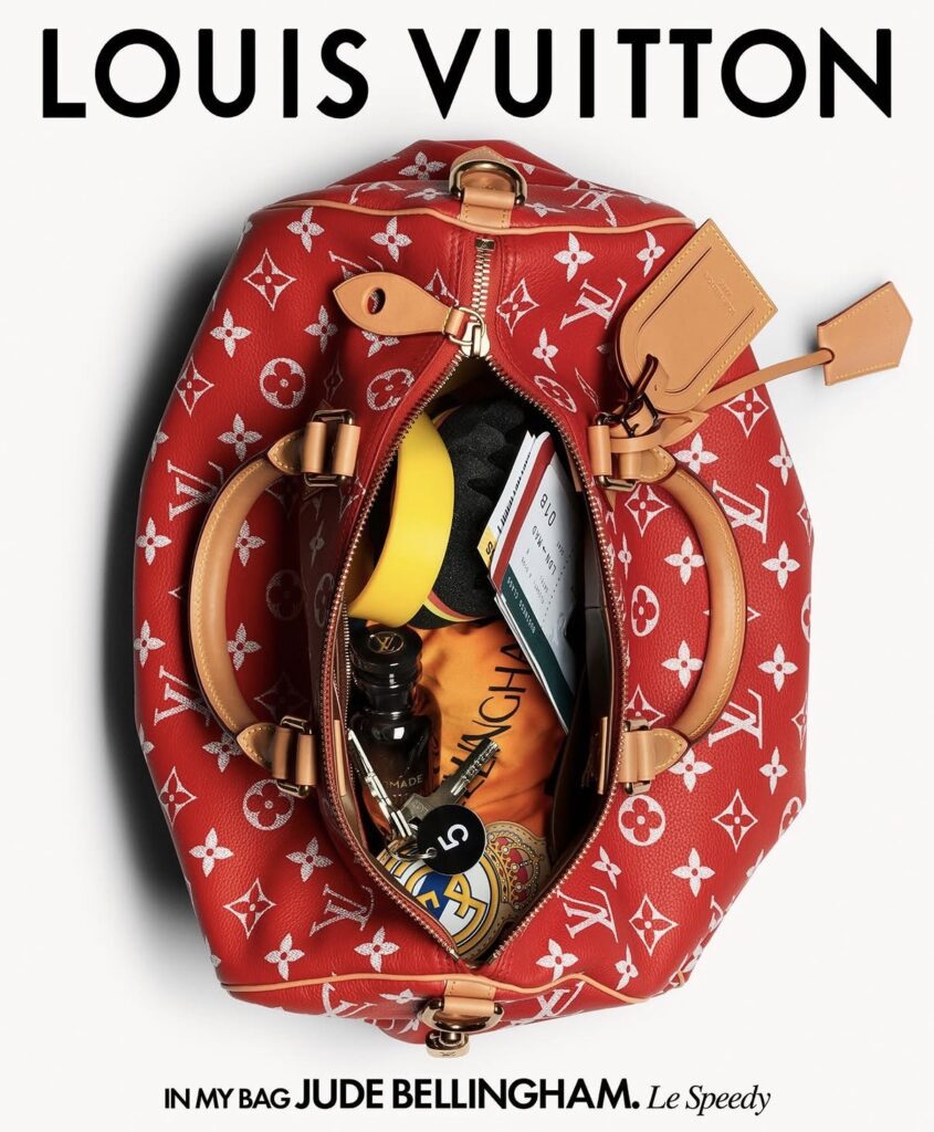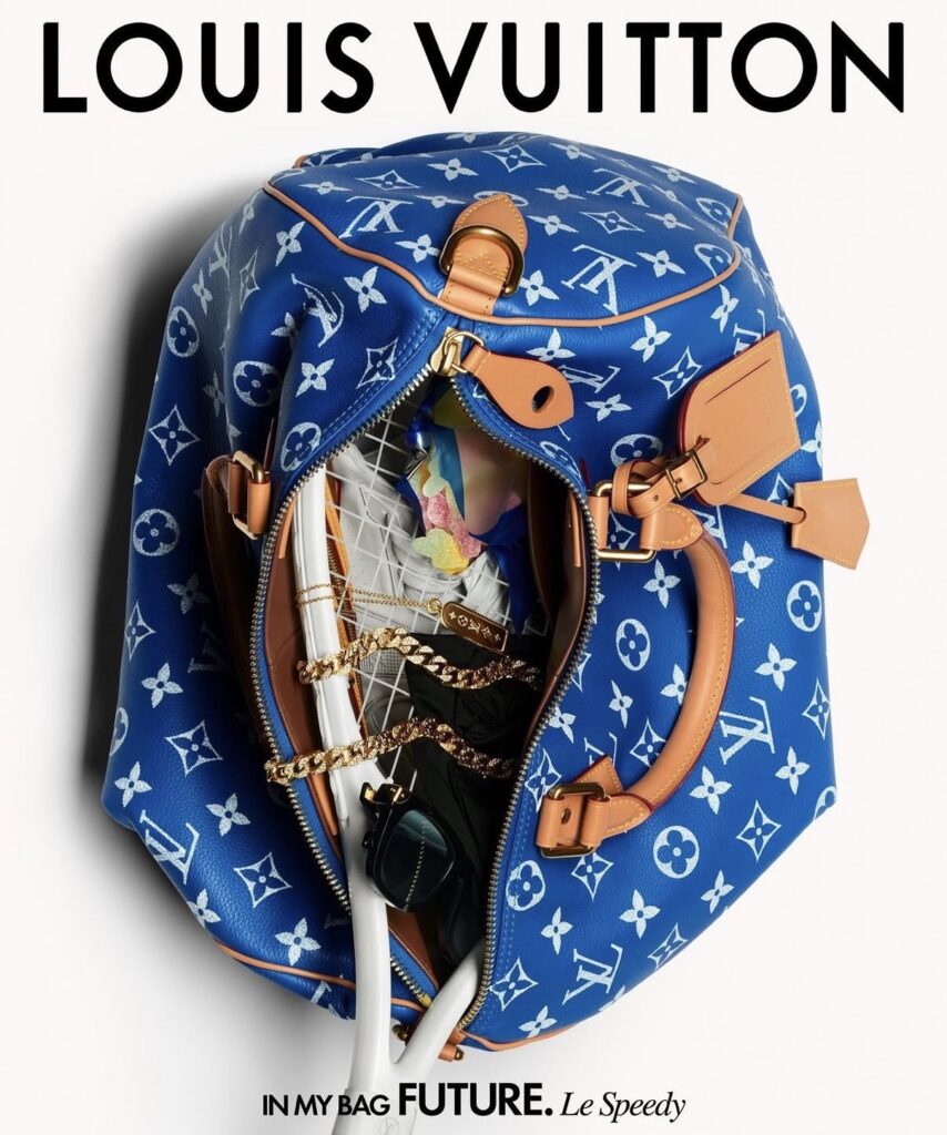 Victor Wembanyama’s aquatic teal version, accented with a Monogram alien charm, carries a deck of cards and wired headphones, while Jude Bellingham’s bold red bag is packed for life on the move—aviators, a passport and plane ticket, an official jersey, and personalized keys. On the music front, Future loads his cobalt blue Speedy P9 with a tennis racquet, gold chain, gummy candies, and an extra pair of sneakers. Jackson Wang rounds things out with a playful pink version, complete with a fuzzy dice charm and a mix of hi-fi headphones, a Polaroid photo, and a Rubik’s Cube.