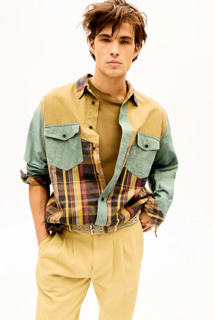 Fall’s prevailing trends appeared subtly throughout, grounded in warm desert hues. Standout pieces included patched jackets with leather detailing, rich plaids such as a mahogany-toned hoodie, a color-blocked button-down, and a Japanese check reinterpretation of the classic denim jacket. A new trouser cut emerged as a key highlight—smartly tailored in cream and hickory stripe Oshkosh—striking a confident balance between formal structure and casual ease.