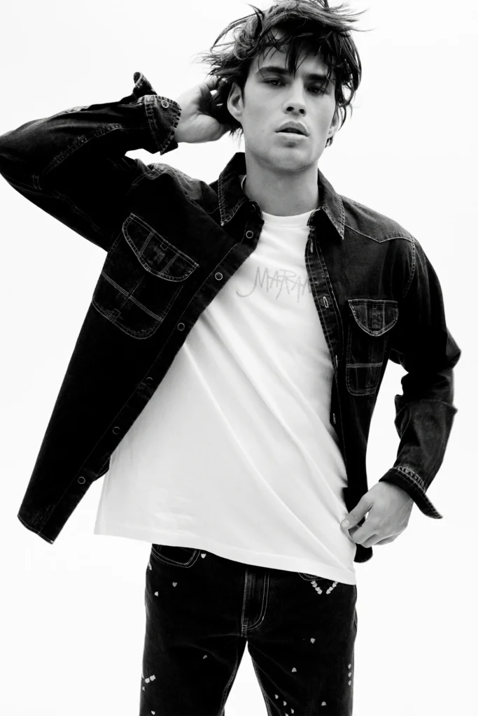 The collection carried a distinctly ’90s attitude, channeled through the effortless cool of Brad Pitt’s breakout role in Thelma & Louise. This nostalgic lens guided the return to menswear fundamentals: the perfect white T-shirt, well-cut denim, and silhouette-defining chore jackets formed the backbone of the lineup.