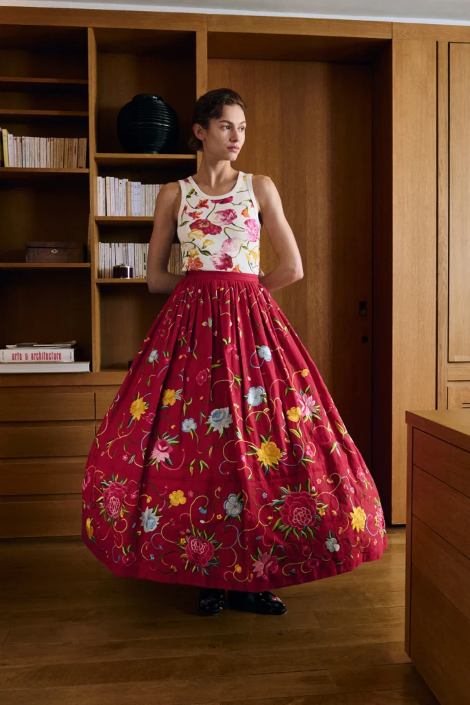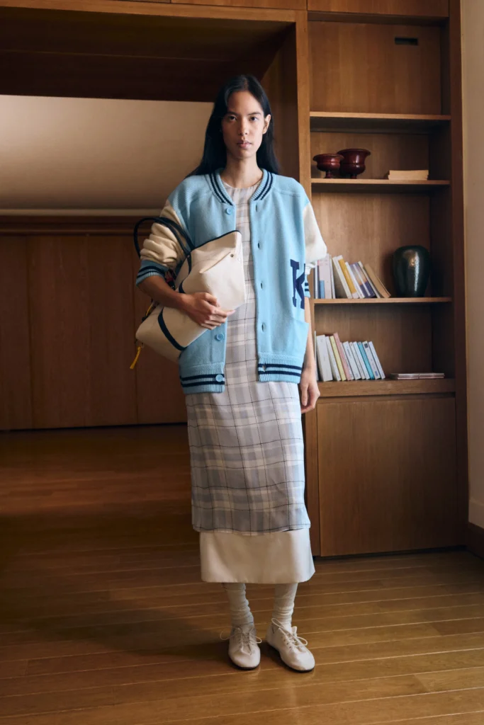 Florals played a central role, most strikingly in embroidered full skirts that bordered on the folkloric and felt directly lifted from the founder’s archives. Elsewhere, Nigo translated Takada’s Japanese tailoring codes into a contemporary wardrobe suited for modern creative professionals. Americana references—varsity jackets, collegiate knits—remained part of the Kenzo vocabulary, but were dialed back and rendered with restraint rather than spectacle.