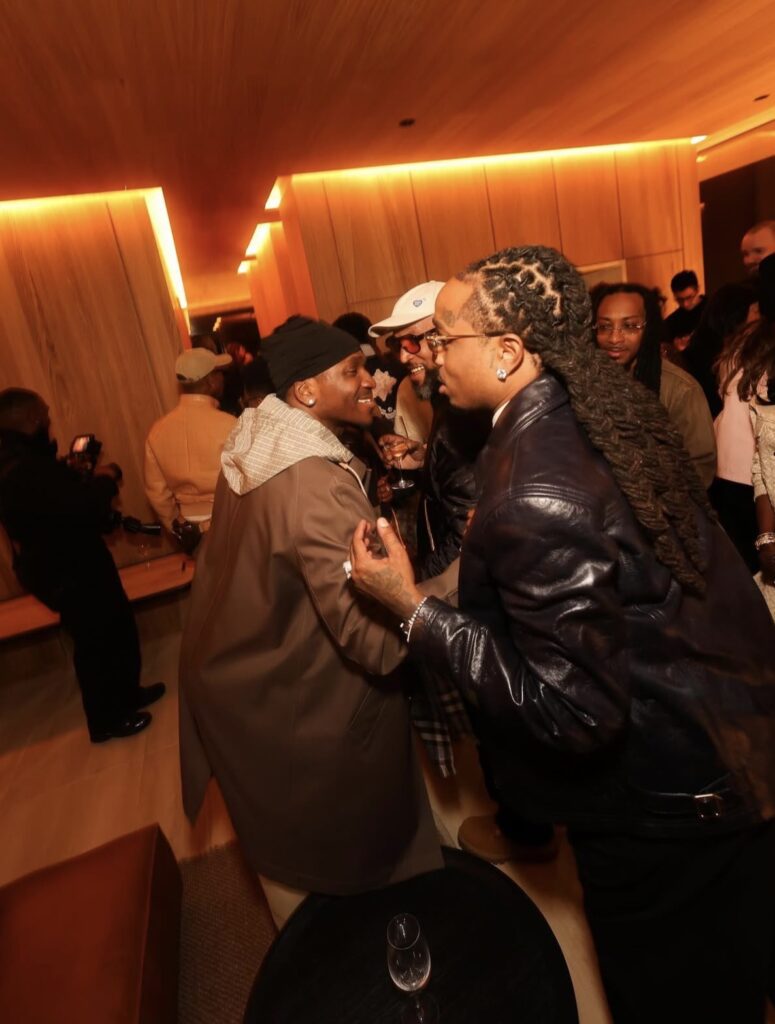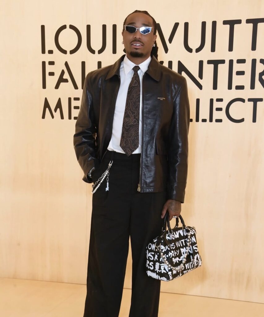 As a Louis Vuitton brand ambassador, Future stayed firmly within his signature lane, styling logo-heavy accessories with a plaid puffer and relaxed denim. The look was instantly recognizable and undeniably on-brand. SZA struck a balance between softness and structure, wearing a rich brown leather coat with subtle pinstripes, grounded by classic Vans for an effortlessly cool finish. Meanwhile, Quavo went full throttle, stepping out in a motorcycle jacket, paisley tie, and grills—an unapologetic statement that made him impossible to ignore.