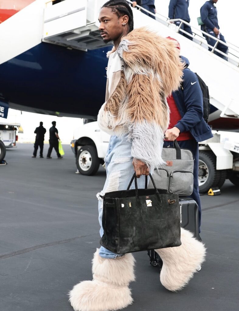 NFL wide receiver Stefon Diggs made a major fashion statement upon arriving in San Francisco for Super Bowl LX. Spotted with the New England Patriots ahead of the game, Diggs stepped out in a rare vintage Chanel Fall/Winter 2010 “Yeti” coat, a standout piece originally designed by Karl Lagerfeld.