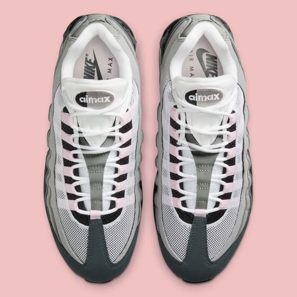 Inspired by the classic Nike Air Max 95 “Neon”, the sneaker swaps the original volt accents for soft “Pink Foam” hits throughout the design. The signature grayscale gradient returns across the layered suede sidewalls, gradually transitioning from light grey to darker tones along the upper. Pops of pink appear on the eyelets, mini Swoosh branding, visible Air units, and outsole, offering a vibrant contrast against the otherwise monochrome base.