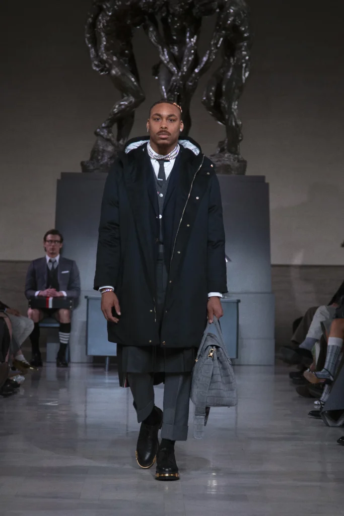 Sports and fashion did intersect on the runway, however, with NFL figures Marcus Allen, Justin Jefferson, and DeAndre Hopkins making rare catwalk appearances. Their presence underscored Browne’s goal of introducing his work to a broader audience while reaffirming the universal appeal of precise tailoring.