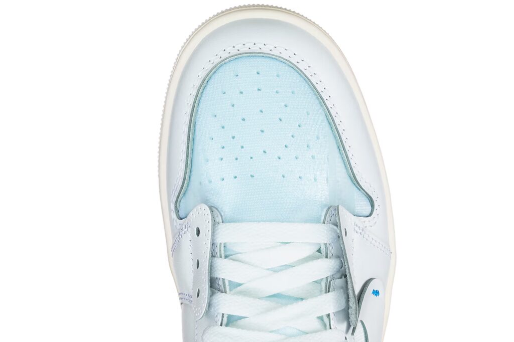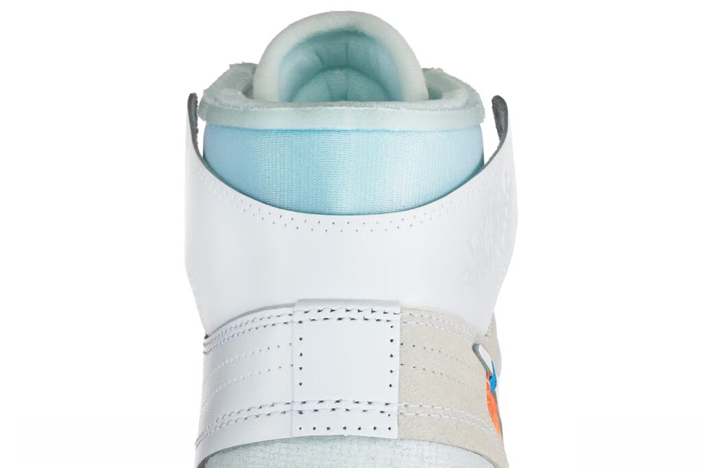 The Air Jordan 1 arrives with an open, deconstructed build, highlighted by Abloh’s signature exposed tongue and the unmistakable orange tab stitched onto the Swoosh. Staying consistent with his industrial design language, bold black “AIR” lettering is stamped across the midsole, drawing attention to the sneaker’s internal cushioning system—one of Abloh’s longtime fascinations.