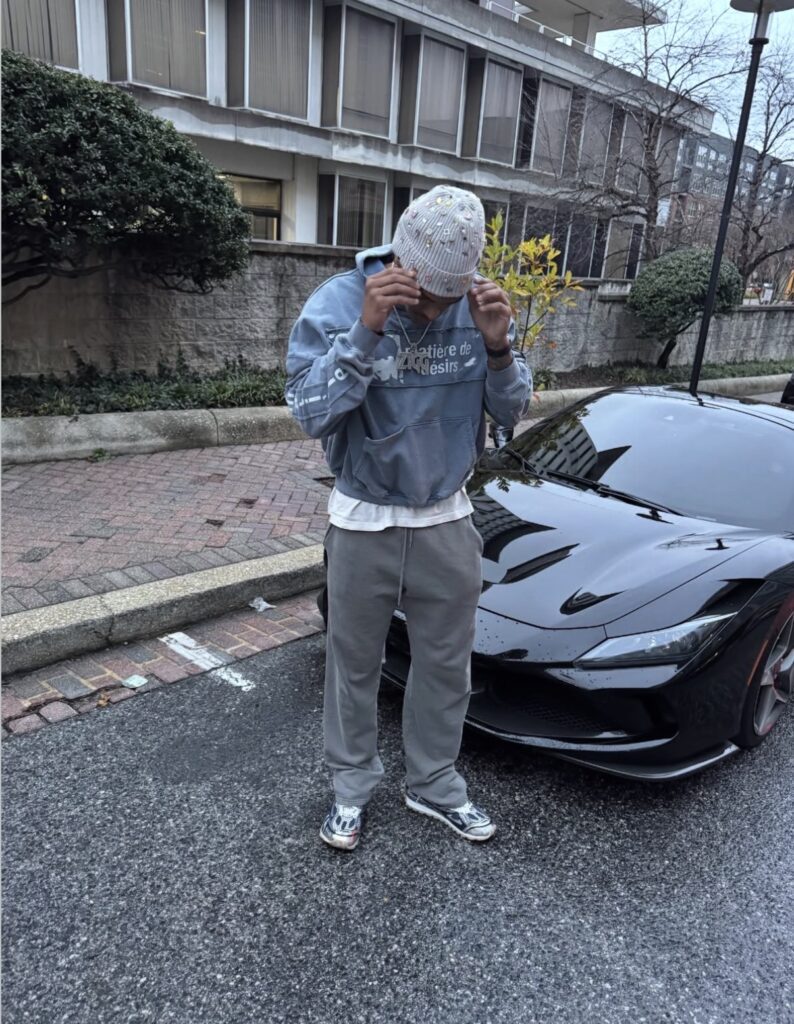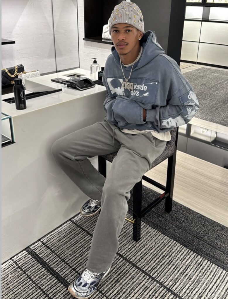 Ahead of the news, the 23-year-old showcased his off-duty style with a clean, understated fit. Wheatley wore a Matière De Désirs Encore Hoodie in washed blue, layered over a crisp white tee and paired with straight-leg steel grey sweatpants. Keeping the palette cool and cohesive, he finished the look with Bottega Veneta Orbit Lace-Up Sneakers, while a Sheisty Jewelz cuff beanie added a subtle statement to the ensemble.